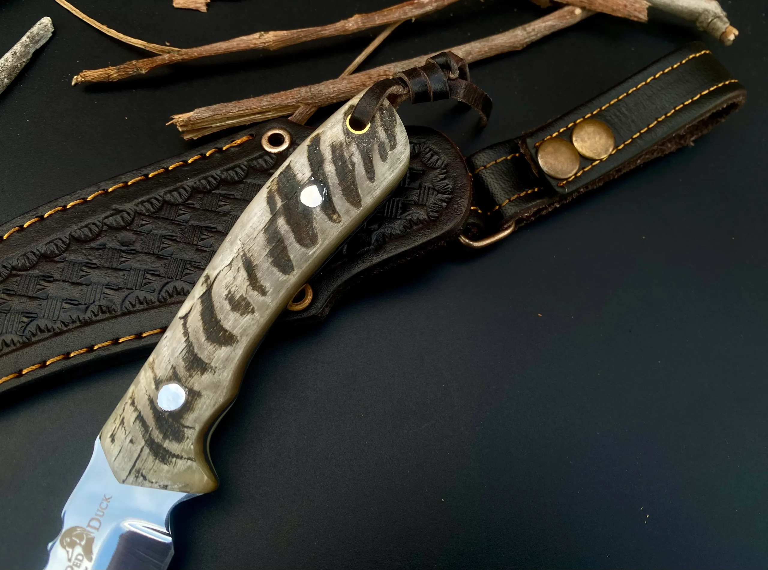 The Apache Thunderbolt 400 Hunting Knife RFQ offers a drop-point or gut-hook blade for precision and power. Its 4.00-inch mirror-polished 12C27 stainless steel blade and genuine Ram’s Horn handle provide strength and grip. A low-profile leather sheath ensures it’s easy to carry. Own the legend today!
