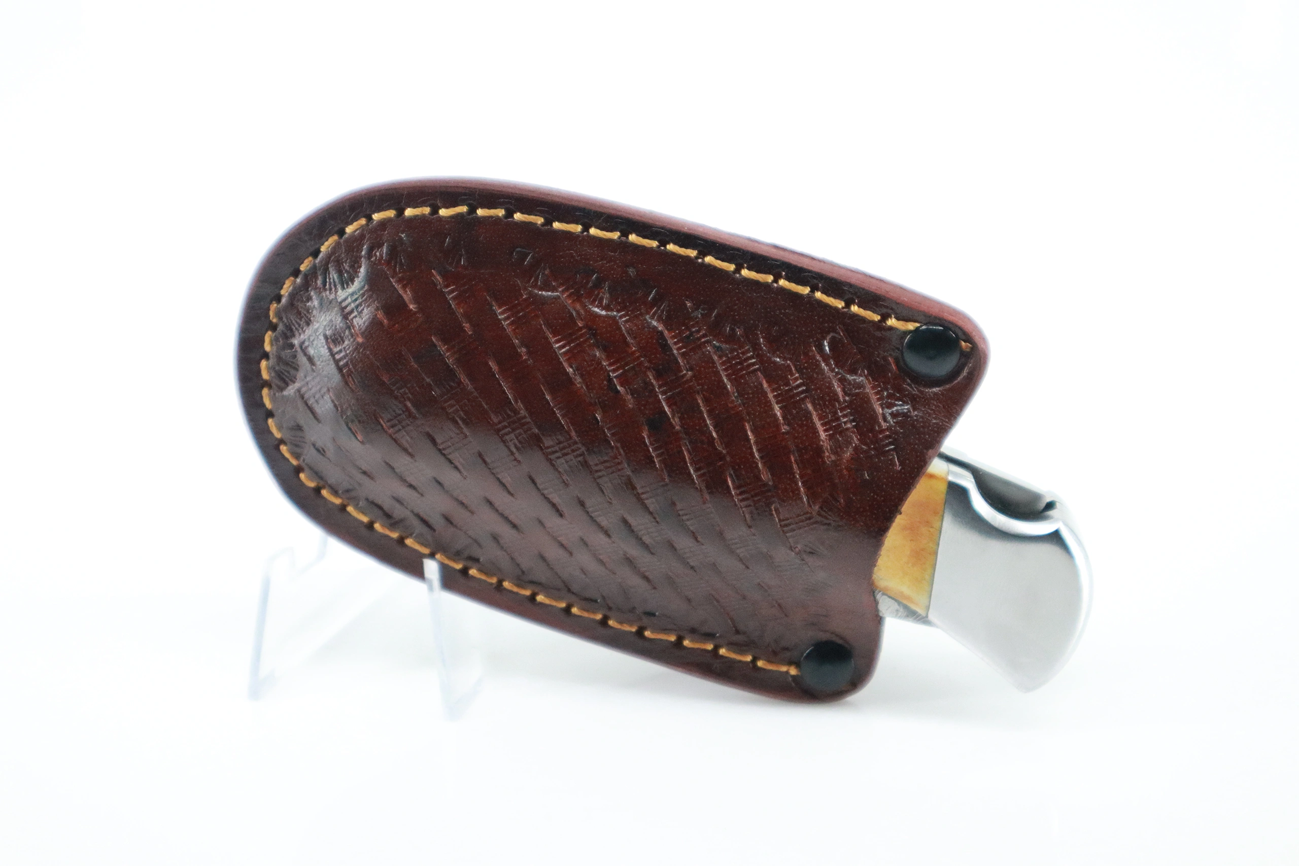 Experience the power of an 8.83-inch folding knife with a razor-sharp 3.75-inch blade for excellent cutting. Its smooth opening mechanism and secure lock ensure reliability, while the Spider Web Canvas Micarta or Red Deer Antler handle adds beauty and durability. The knife comes with two leather sheaths, including a quick draw.